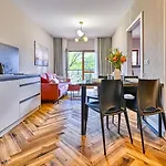 La résidence offre à ses clients un balcon et un coin salon, ainsi que des conforts modernes tels qu'un lave-linge. Cette propriété Royal Aparts Green Park Resort Vip Z Basenami, Saunami, Jacuzzi I Silownia dispose d'une salle de bains avec sèche-cheveux et draps de bain. De plus, vous trouverez une toilette séparée et une douche.
